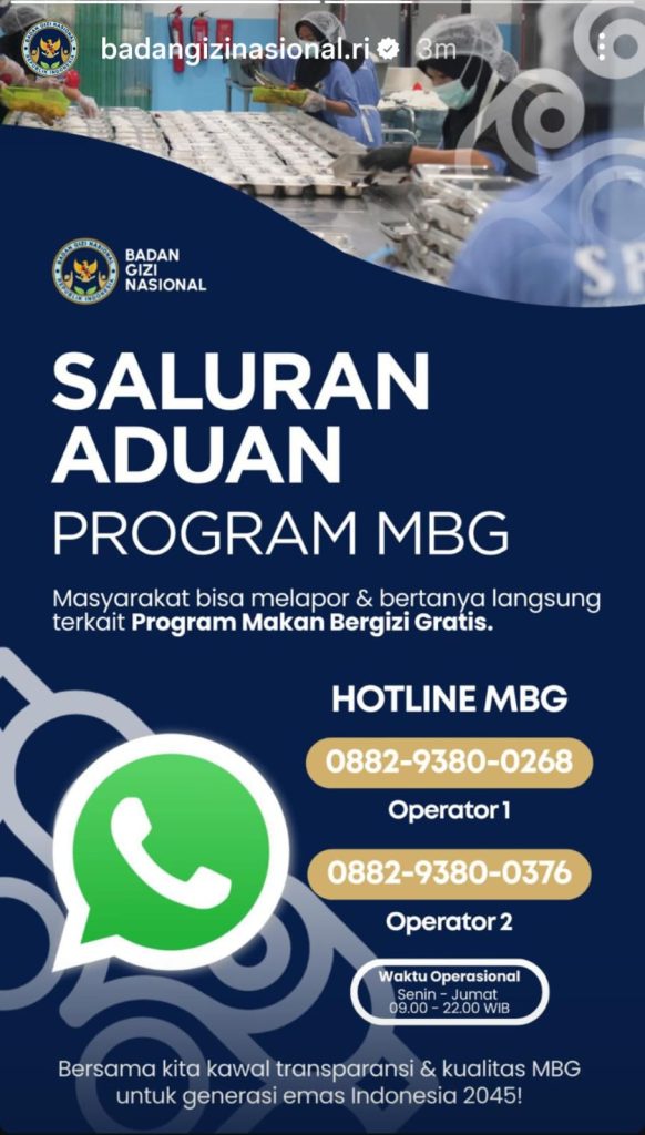 Selain itu, masyarakat juga bisa melaporkan atau menanyakan langsung terkait program MBG melalui saluran resmi Badan Gizi Nasional. Hotline MBG bisa dihubungi di nomor 0882-9380-0268 (Operator 1) atau 0882-9380-0376 (Operator 2).