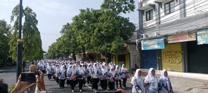 POJOKKATA.COM, ONOROGO – Ribuan guru yang tergabung dalam Persatuan Guru Republik Indonesia (PGRI) Kabupaten Ponorogo turun ke jalan, Selasa (30/12). Mereka menggelar aksi long march dari depan Gedung Terpadu Pemkab Ponorogo menuju Kantor Cabang Dinas Pendidikan (Cabdindik) Provinsi Jawa Timur Wilayah Ponorogo di Jalan Gajah Mada.