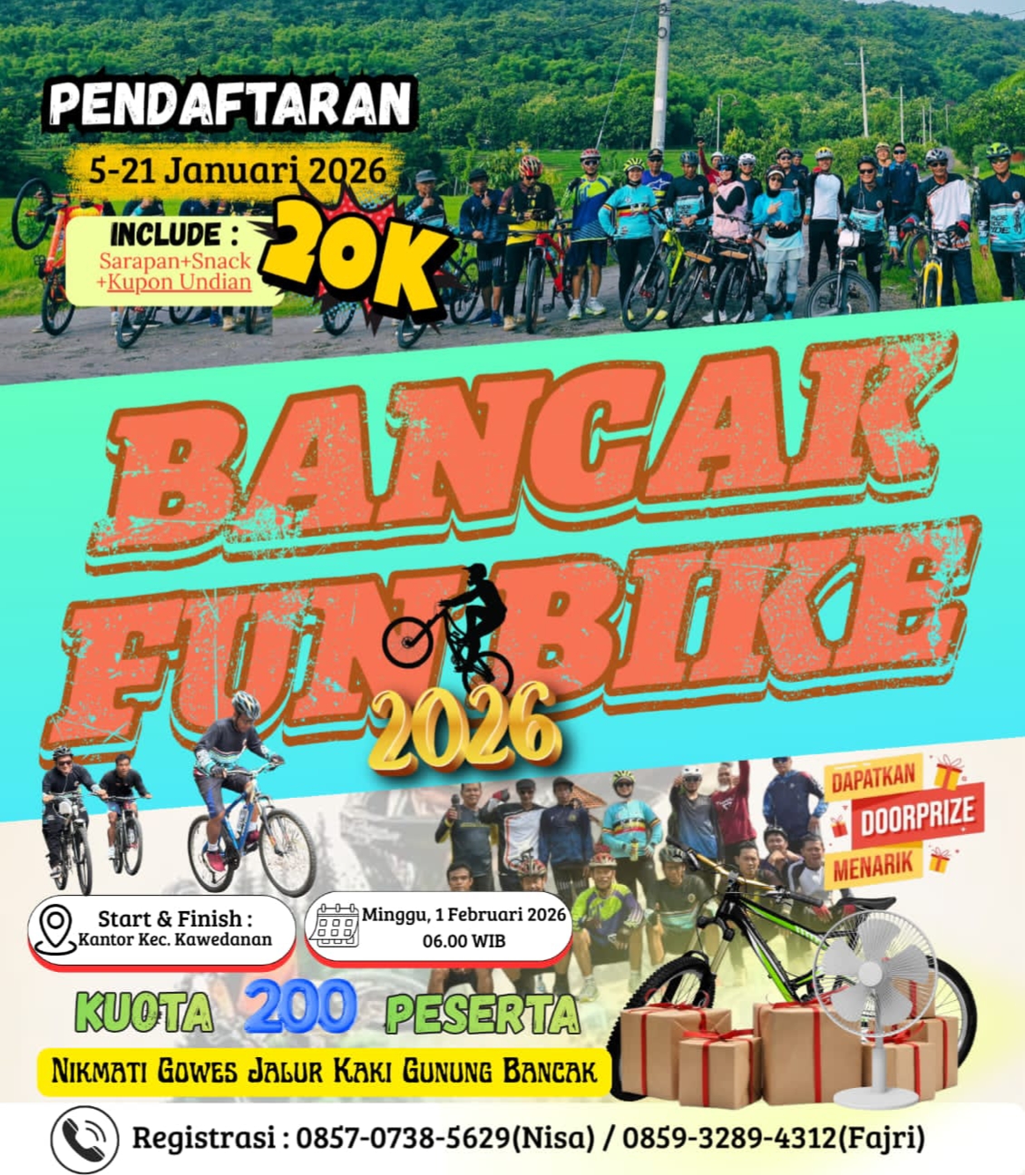 “Hanya Rp 20 ribu, peserta sudah mendapatkan sarapan, snack, dan kupon undian dengan puluhan doorprize menarik. Hadiah utamanya sepeda,” jelas panitia.