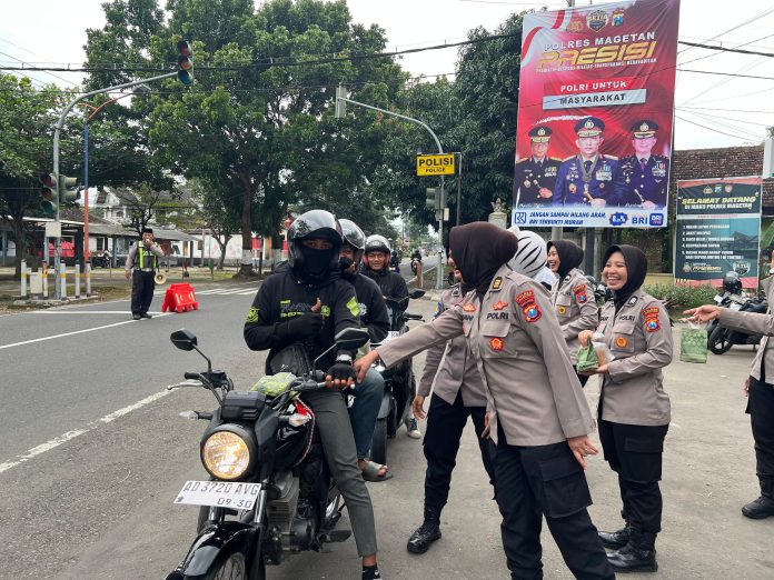 POJOKKATA.COM, Magetan – Senja di depan Mako Polres Magetan, Rabu (25/2/2026), terasa berbeda. Di tengah lalu lintas yang masih padat menjelang waktu berbuka, deretan Polisi Wanita (Polwan) Polres Magetan berdiri dengan senyum ramah.
