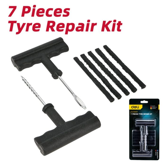 Salah satu produk yang tersedia di pasaran adalah Deli Tools 7 Pieces Tyre Repair Kit. Perlengkapan ini menyediakan berbagai alat penting dalam satu paket ringkas untuk membantu perbaikan ban tubeless pada sepeda motor maupun mobil.